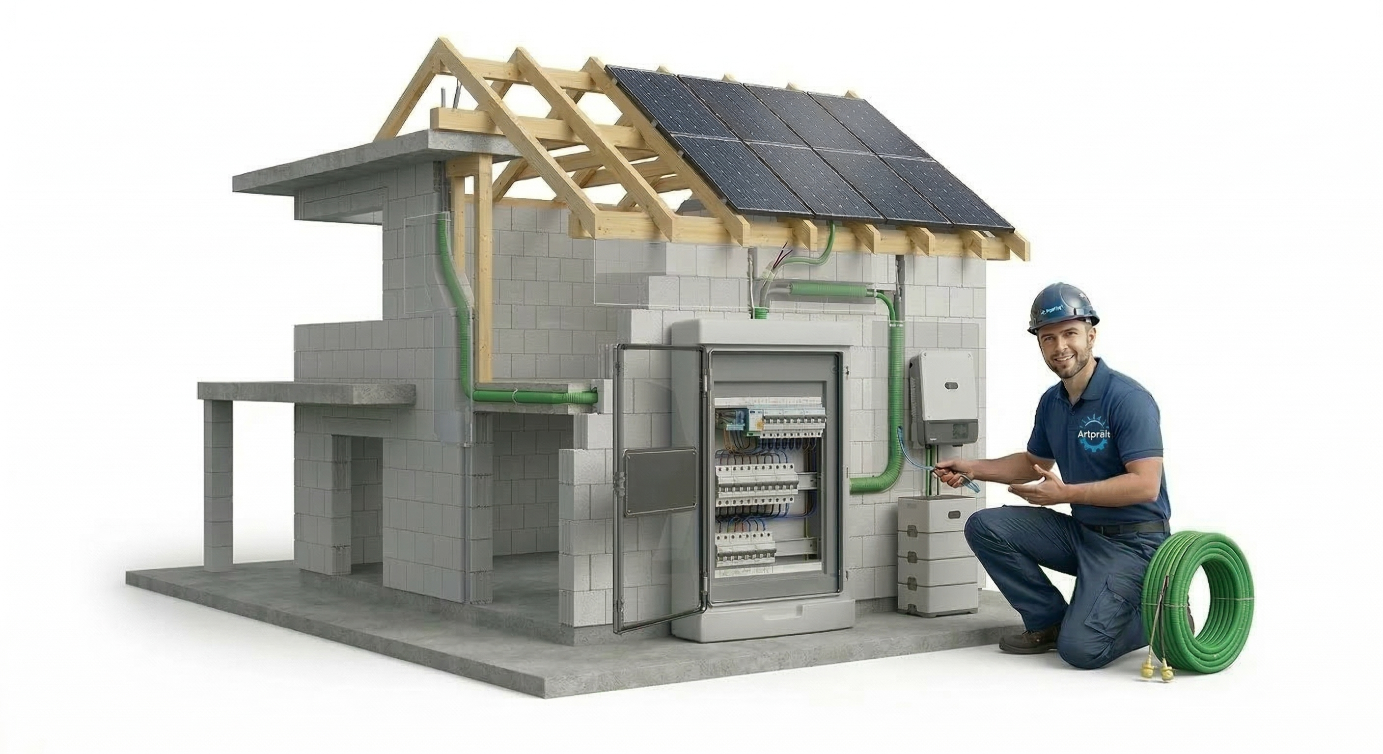 Plánujete v budoucnu fotovoltaickou elektrárnu, ale aktuálně máte napjatý rozpočet? Nedovolte, aby se z dodatečné instalace stala noční můra plná bourání hotových fasád a sekání do nových omítek. Zajistíme kompletní "FVE Ready" přípravu, díky které bude váš dům připraven na následnou instalaci systému.