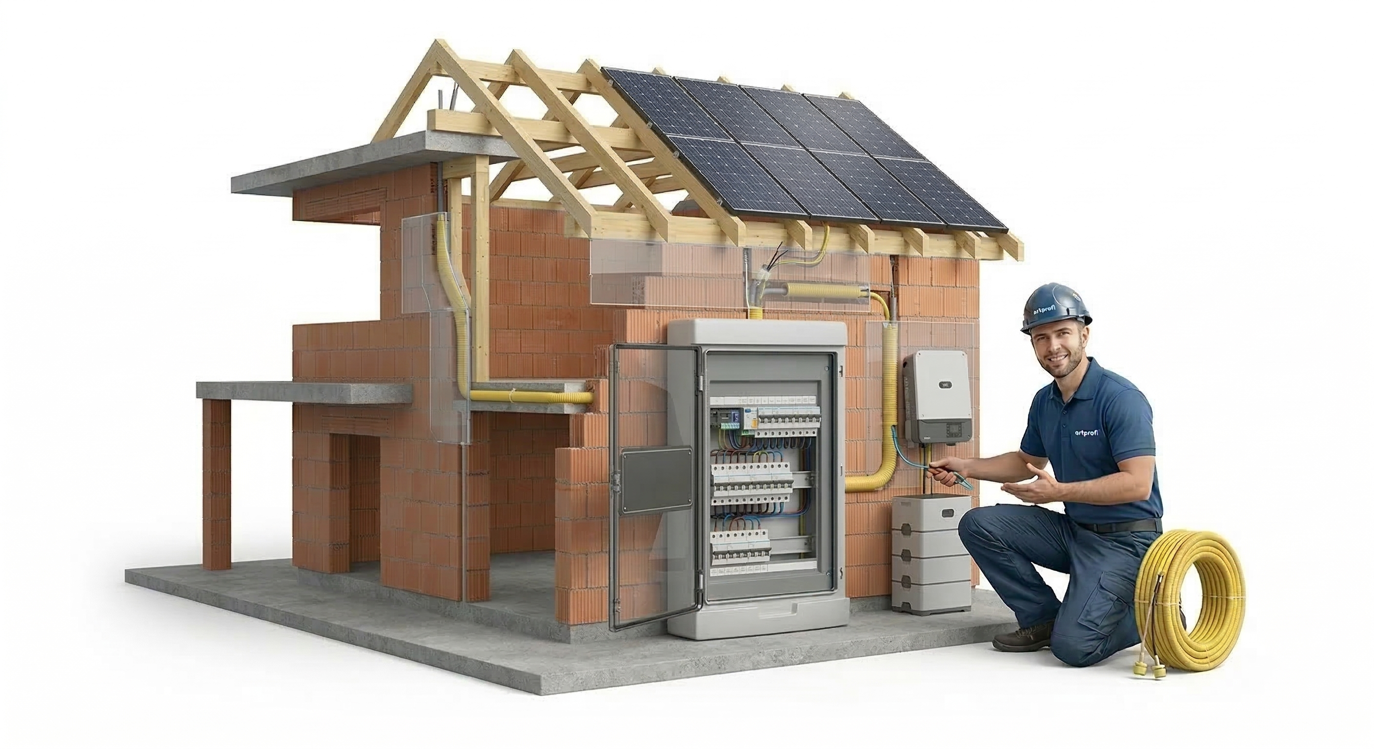 - Datová a komunikační kabeláž Příprava kabelů (UTP/FTP) pro monitoring, chytrou domácnost, připojení bateriového úložiště a komunikaci s elektroměrem