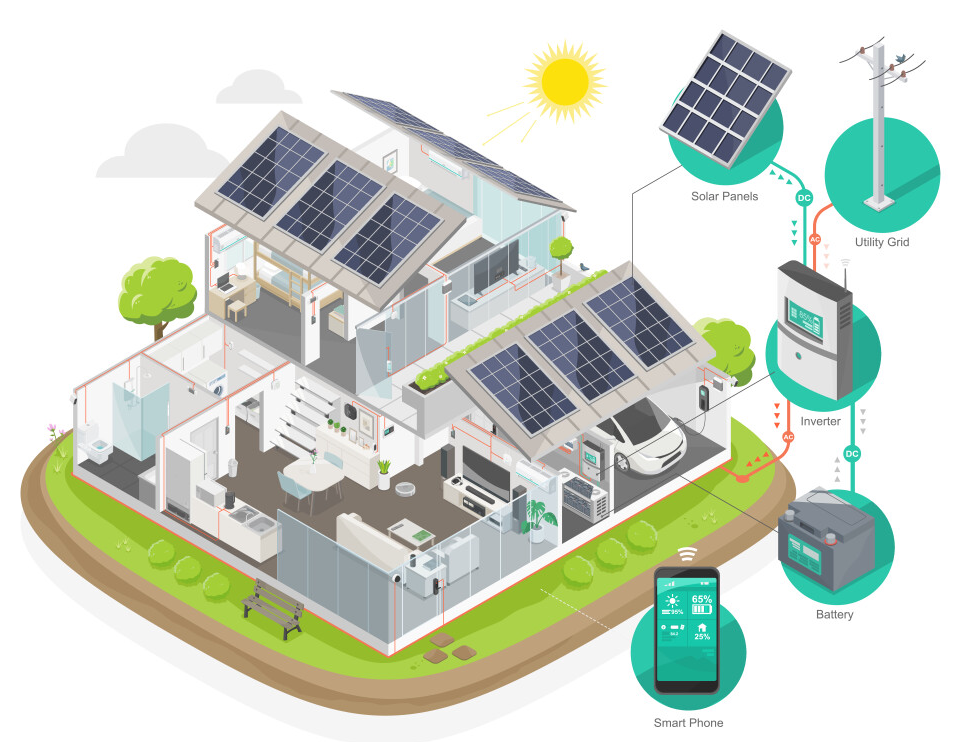 - Fotovoltaické panely: Při dostatečném osvitu vyrábí elektřinu ve formě stejnosměrného proudu. Lze je umístit na střechu domu, garáže nebo pergoly. Čím více panelů je instalováno, tím větší je výkon elektrárny. Panely mohou vyrábět elektřinu i za slabého osvětlení, i když v menším množství. Čím déle jsou panely osvíceny, tím více elektřiny za rok vyrobí.