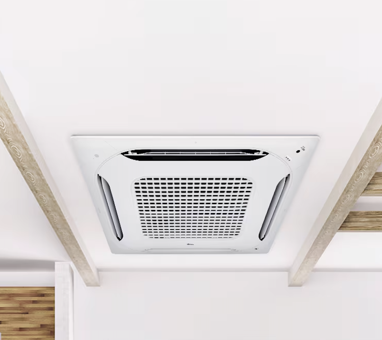 Kazetová jednotka, která se umisťuje do podhledů fouká na všechny 4 strany. Výhodou je, že se celá "schová" do podhledu a ze stropu tedy nic nevystupuje.